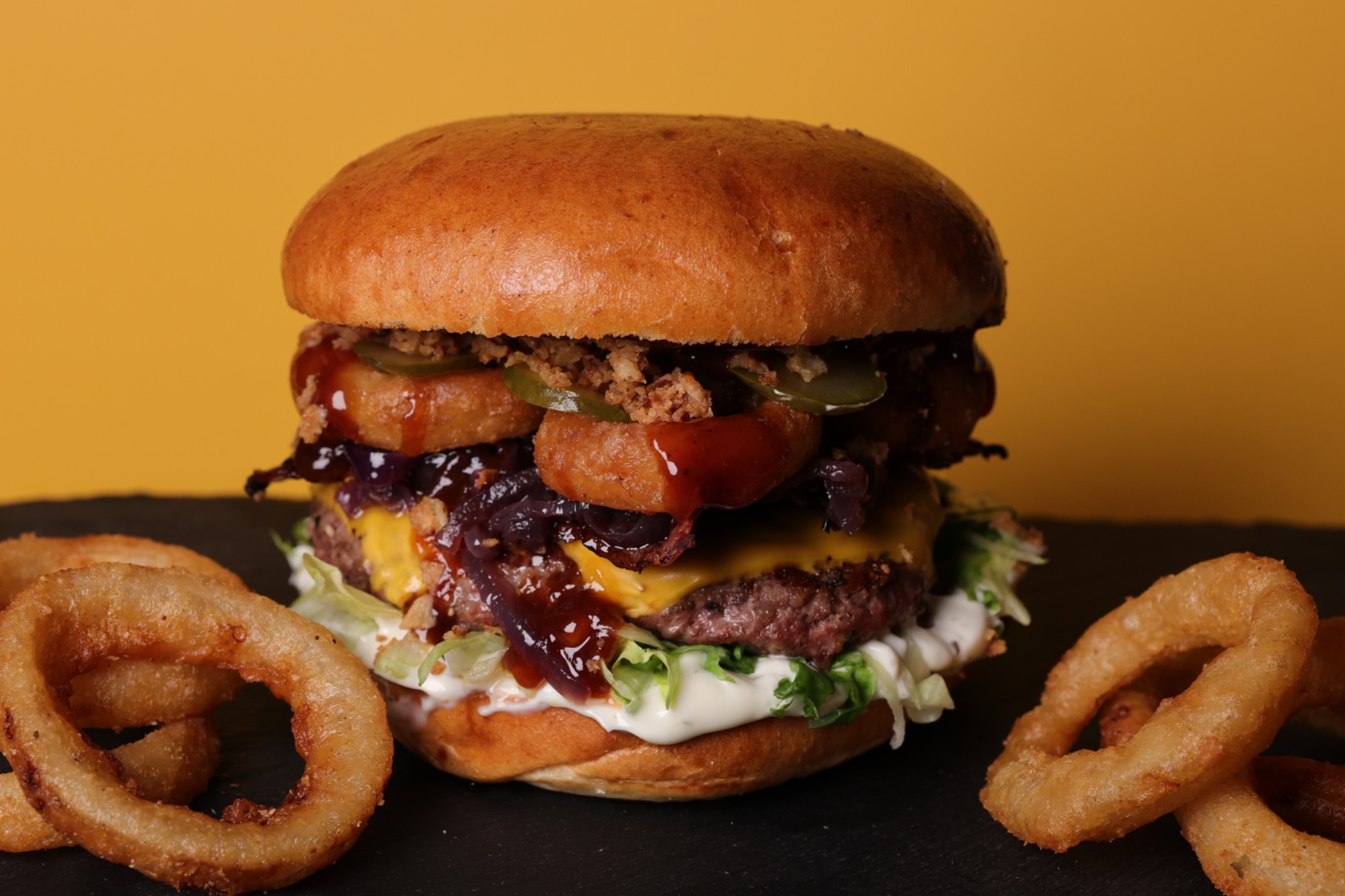 bułka maślana, beyond meat, 2x ser cheddar, 3x krążki cebulowe, cebulka karmelizowana, cebulka prażona, ogórek konserwowy, sałata, BBQ, sos aioli -